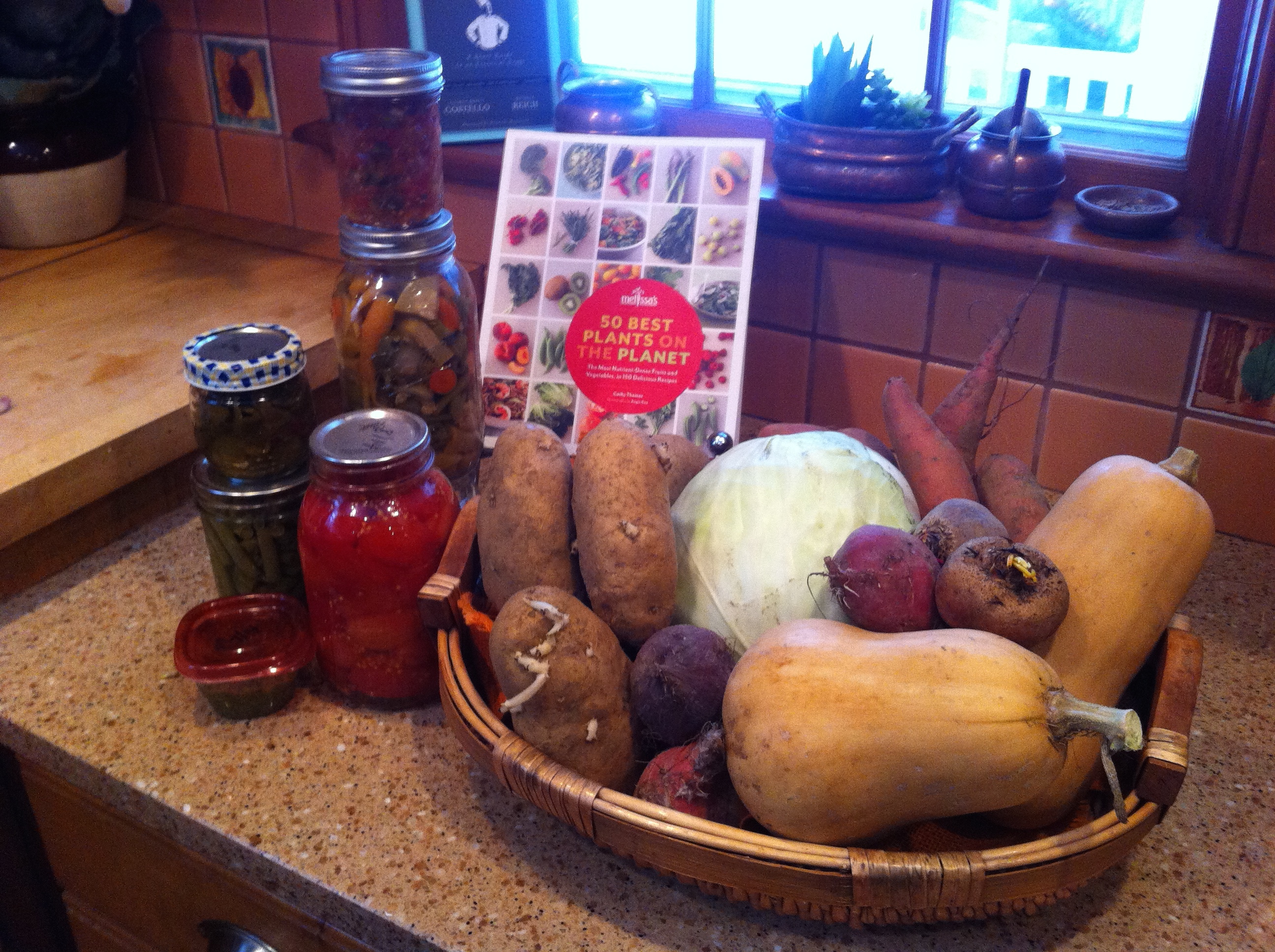 In the basket are russet potatoes, beets, a cabbage, sweet potatoes, and butternut squash. In jars are mixed pickled veggies, bread and butter pickles, green beans,tomatoes, salsa and pesto. In my freezer I have chard, roasted tomatoes, and pumpkin puree. They weren’t photogenic enough for the photo op.